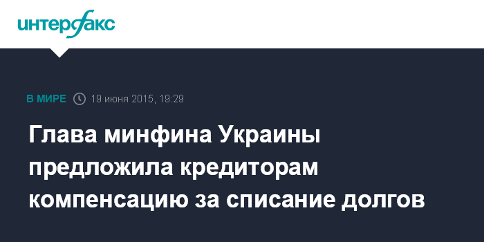 Москва. 19 июня. INTERFAX.RU - Украина обсуждает с кредиторами возможность выпуска в процессе реструктуризации инструмента восстановления стоимости, который будет компенсировать потери кредиторов от списания долга в случае, если экономика будет восстанавливаться быстрее, чем прогнозировалась, сообщила министр финансов Наталия Яресько.
