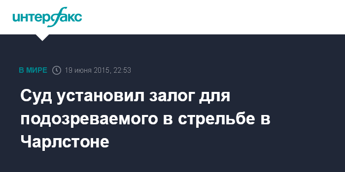 Москва. 19 июня. INTERFAX.RU - Суд города Чарлстон (штат Южная Каролина, США) установил залог в размере $1 млн для 21-летнего Диланна Руфа, арестованного по подозрению в организации перестрелки в местной церкви, сообщили в пятницу американские СМИ.