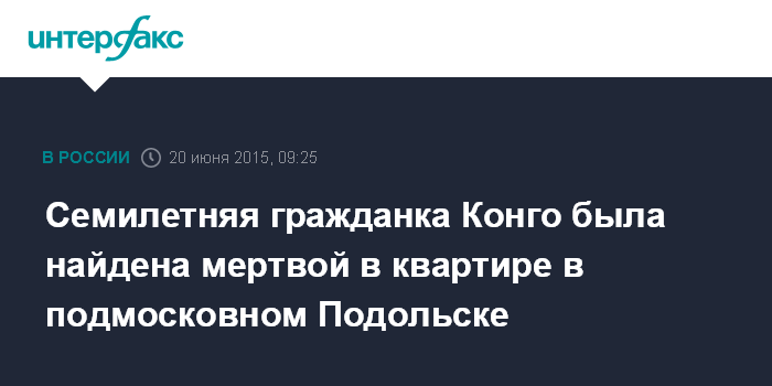 Москва. 20 июня. INTERFAX.RU - Девочка из Конго обнаружена мертвой в квартире в подмосковном Подольске, где она проживала с матерью, сообщил "Интерфаксу" в субботу источник в правоохранительных органах.