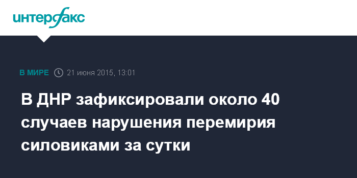 Москва. 21 июня. INTERFAX.RU - В министерстве обороны самопровозглашенной Донецкой народной республики сообщают о 38 случаях нарушения режима прекращения огня за последние сутки.