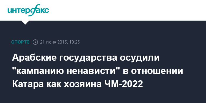 Москва. 21 июня. INTERFAX.RU - Лига арабских государств (ЛАГ) выступила с заявлением в поддержку проведения чемпионата мира по футболу 2022 года в Катаре.
