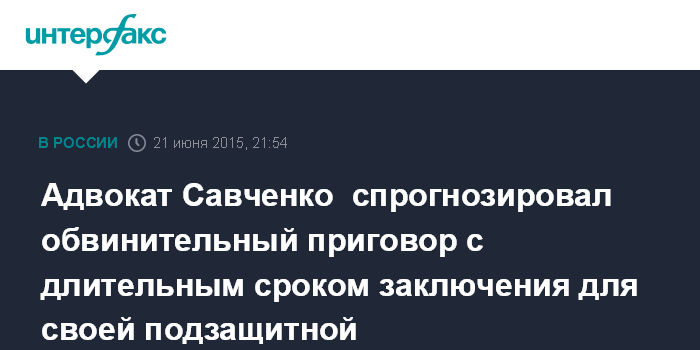Москва. 21 июня. INTERFAX.RU - Защита украинской летчицы Надежды Савченко, находящейся в России под следствием по делу об убийстве российских журналистов, прогнозирует вынесение подзащитной обвинительного приговора с длительным сроком заключения.