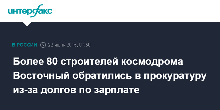 Москва. 22 июня. INTERFAX.RU - Коллективное заявление с жалобой на невыплату заработной платы поступило в прокуратуру от строителей космодрома Восточный (Амурская область), сообщил агентству "Интерфакс" исполняющий обязанности прокурора космодрома Восточный Виталий Бондаренко.