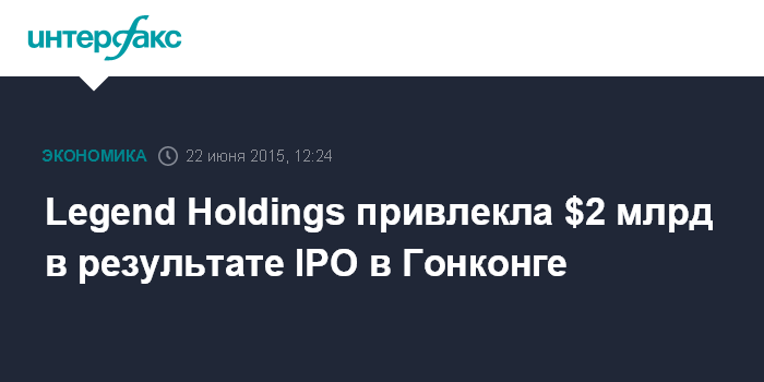Москва. 22 июня. INTERFAX.RU - Китайский конгломерат Legend Holdings, крупнейший акционер мирового лидера по продажам персональных компьютеров Lenovo Group, привлек почти $2 млрд в ходе первичного размещения акций (IPO) в Гонконге, проведя прайсинг вблизи верхней границы прогнозного диапазона, сообщает агентство Bloomberg со ссылкой на источники.