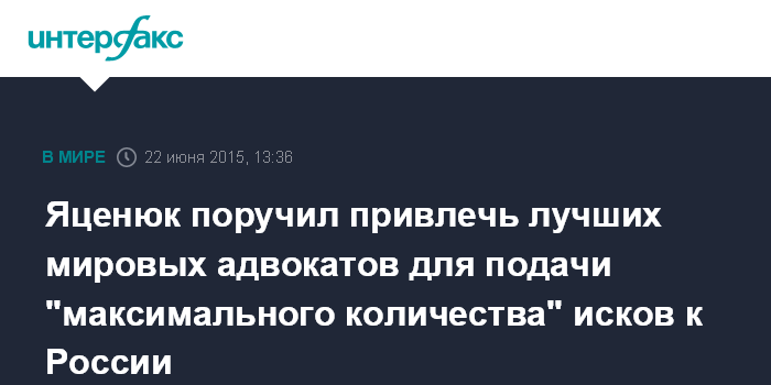 Москва. 22 июня. INTERFAX.RU - Премьер-министр Украины Арсений Яценюк поручил привлечь лучших адвокатов, чтобы подать максимальное количество исков к России для компенсации убытков в связи с присоединением Крыма и событиями в Донбассе.