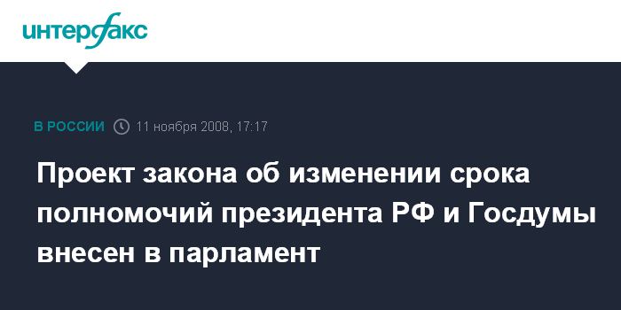 Москва. 11 ноября. INTERFAX.RU - Президент России Дмитрий Медведев внес в Госдуму проекты законов о поправках к Конституции "Об изменении срока полномочий президента РФ и Государственной Думы" и "О контрольных полномочиях Государственной Думы в отношении правительства РФ", сообщила пресс-служба Кремля.