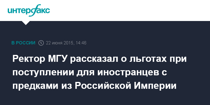 "Гипотетически, если финн придет и докажет, что его прабабушка жила в Российской Империи, он имеет право поступить как соотечественник. Или приедет с Аляски американец и докажет, что у него прапрапрабабушка жила в Российской Империи", - сказал Садовничий на пресс-конференции в понедельник, отвечая на вопрос "Интерфакса".