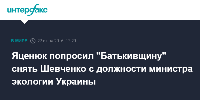 Москва. 22 июня. INTERFAX.RU - Премьер Украины Арсений Яценюк обратился к партии "ВО "Батькивщина" с просьбой рассмотреть целесообразность нахождения в должности министра экологии и природных ресурсов Игоря Шевченко, сообщил советник главы правительства Данил Лубкивский.