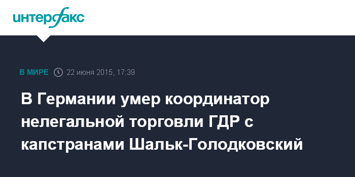 Москва. 22 июня. INTERFAX.RU - Экс-глава секретного отдела коммерческой координации в министерстве внешней торговли ГДР Александр Шальк-Голодковский скончался на 83-м году жизни, сообщает в понедельник агентство Associated Press.