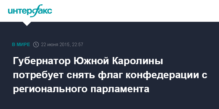 Москва. 22 июня. INTERFAX.RU - Глава американского штата Южная Каролина Никки Хейли обратится с призывом спустить с флагштока здания законодательного органа штата конфедеративный флаг, сообщает в понедельник местное издание "Пост энд Курьер".