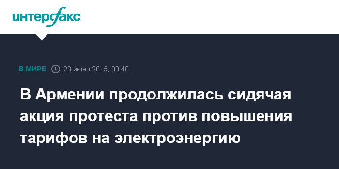 Москва. 23 июня. INTERFAX.RU - В центре Еревана несколько сотен человек проводят сидячую акцию протеста против повышения цен на электроэнергию. В связи с этим председатель Общественного совета Армении Вазген Манукян призвал Государственную комиссию по регулированию общественных услуг