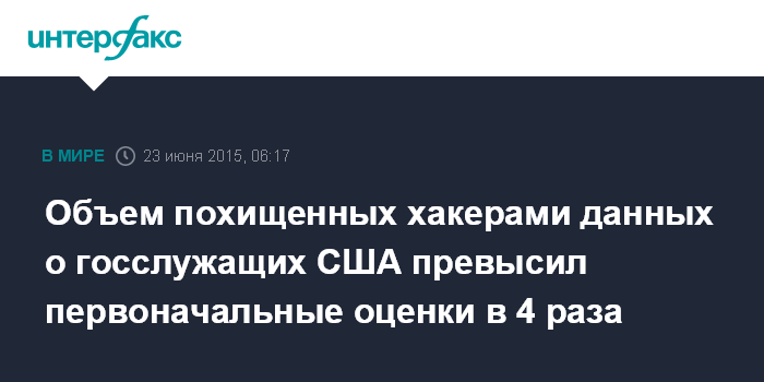 Москва. 23 июня. INTERFAX.RU - Неизвестные взломщики похитили персональные данные о 18 миллионах американских госслужащих, что превысило первоначальные оценки более чем в четыре раза, сообщил во вторник телеканал CNN со ссылкой на представителей власти, знакомых с ходом расследования.