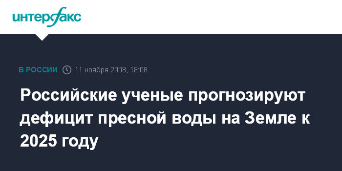 "К 2025 г., по крайней мере, половина растущего населения Земли будет страдать от дефицита пресной воды", - сказал член-корреспондент Российской академии наук Виктор Данилов-Данильян на заседании президиума РАН. Его слова которого цитирует пресс-служба академии.