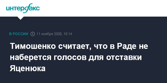 Киев. 11 ноября. INTERFAX.RU - Премьер-министр Украины Юлия Тимошенко считает, что в Верховной Раде не наберется количество голосов, необходимое для отставки спикера Арсения Яценюка.