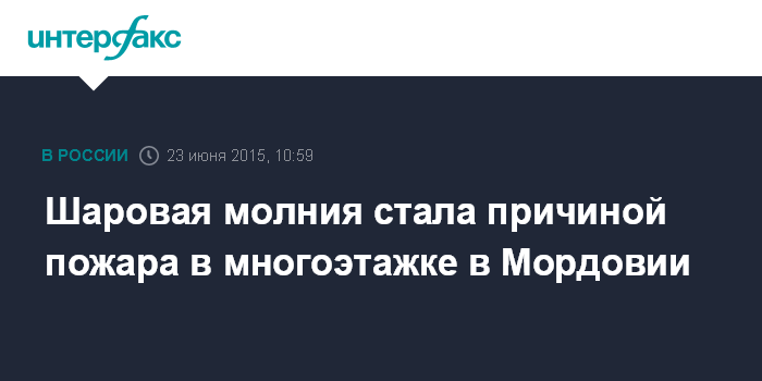Москва. 23 июня. INTERFAX.RU - Шаровая молния стала причиной пожара в квартире многоэтажного дома в центре Саранска.