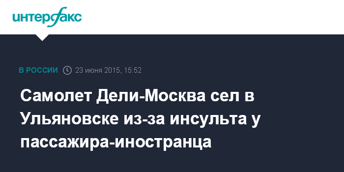"Во время полета одному из пассажиров, 62-летнему гражданину Швеции, индусу по национальности, стало плохо, поэтому самолет в 8:33 по московскому времени совершил посадку в аэропорту Ульяновска. Там иностранца встретили медики и госпитализировали в ульяновскую городскую клиническую больницу с предварительным диагнозом "инсульт", - сообщила собеседница агентства.