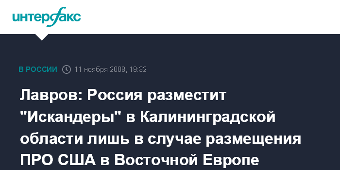 Москва. 11 ноября. ИНТЕРФАКС - Ракетные комплексы "Искандер" будут размещены в Калининградской области в том случае, если размещение элементов ПРО США в Восточной Европе станет реальностью, заявил глава МИД РФ Сергей Лавров.