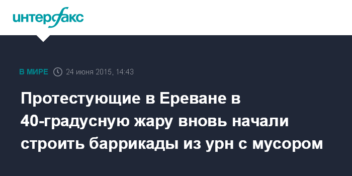 Москва. 24 июня. INTERFAX.RU - Участники акции протеста против повышения тарифов на электроэнергию принесли на проспект Баграмяна в центре Еревана новые мусорные урны, с помощью который они забаррикадировались от сил полиции.