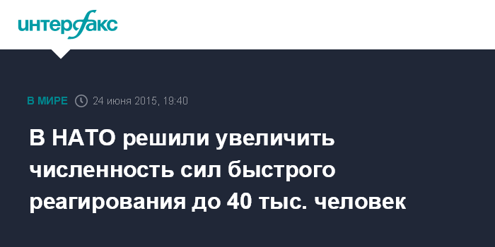 Москва. 24 июня. INTERFAX.RU - Министры обороны стран НАТО приняли решение увеличить численность сил быстрого реагирования до 40 тыс. человек, заявил в среду вечером на пресс-конференции генсек альянса Йенс Столтенберг. Таким образом, эти силы увеличатся в три раза по сравнению с прежней численностью в 13 тыс. человек.