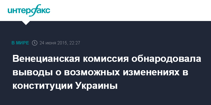 Москва. 24 июня. INTERFAX.RU - Европейская комиссия "За демократию и право" (Венецианская комиссия) в среду опубликовала выводы о предполагаемых поправках в конституцию Украины в части территориального устройства и местных администраций.