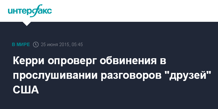 Москва. 25 июня. INTERFAX.RU - Госсекретарь США Джон Керри опроверг сообщения о прослушивании американскими спецслужбами телефонов французских руководителей, включая телефон президента Франсуа Олланда.