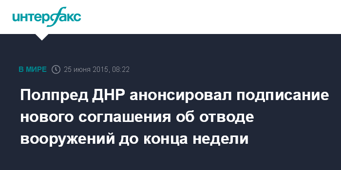Москва. 25 июня. INTERFAX.RU - Полпред самопровозглашенной Донецкой народной республики в контактной группе Денис Пушилин сообщил о вероятности подписания до конца текущей недели нового соглашения об отводе от линии соприкосновения вооружений калибром до 100 мм.