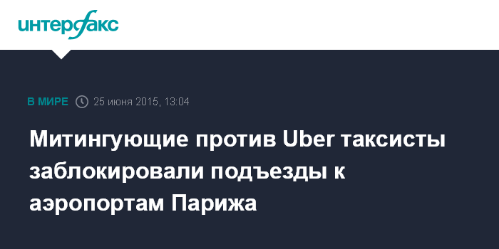 Москва. 25 июня. INTERFAX.RU - Парижские таксисты, протестующие против сервиса заказа такси Uber, в четверг перекрыли доступ к воздушным гаваням французской столицы Орли и Руасси - Шарль де Голль, сообщает агентство Bloomberg.
