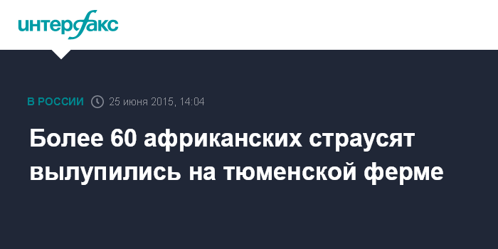 Москва. 25 июня. INTERFAX.RU - У африканских страусов на страусиной ферме в селе Чикча под Тюменью с приходом лета появилось многочисленное потомство.