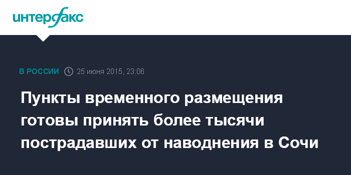 Москва. 25 июня. INTERFAX.RU - Южный региональный центр МЧС России сообщает о развертывании пунктов временного размещения в районах наводнения в Сочи.