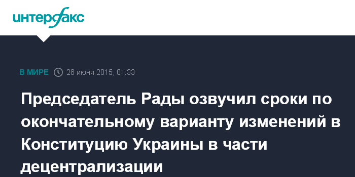 Москва. 26 июня. INTERFAX.RU - Конституционная комиссия в пятницу выйдет на окончательный вариант проекта изменений в Конституцию Украины в части децентрализации, сообщил председатель Верховной Рады Украины Владимир Гройсман.