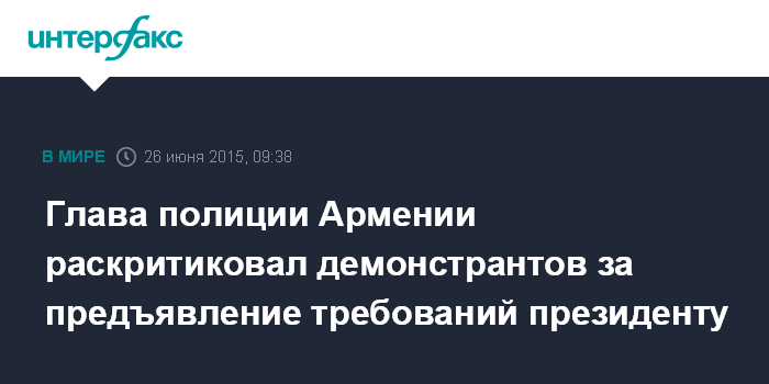 Москва. 26 июня. INTERFAX.RU - Выдвижение требований президенту страны неприемлемо, заявил начальник полиции Армении генерал-лейтенант Владимир Гаспарян.