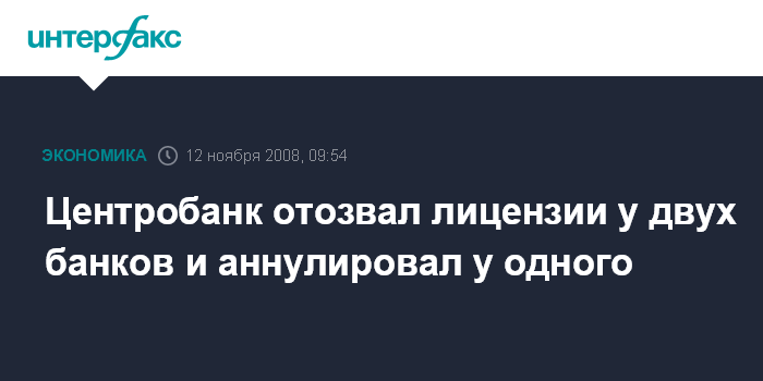 Москва. 12 ноября. INTERFAX.RU - Банк России с 12 ноября отозвал лицензии на осуществление банковских операций у Эконацбанка (Москва) и Мира-банка (Москва), говорится в сообщении департамента внешних и общественных связей ЦБ РФ.