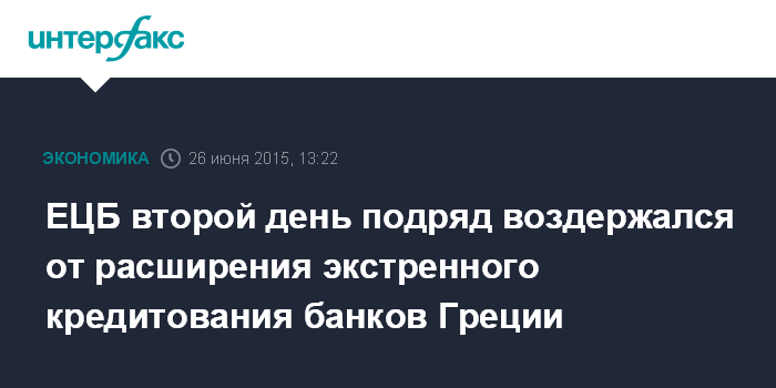 Москва. 26 июня. INTERFAX.RU – Европейский центральный банк в пятницу решил не увеличивать предельный объем финансирования греческих банков в рамках программы экстренного предоставления ликвидности (Emergency Liquidity Assistance, ELA), сообщает агентство Bloomberg со ссылкой на осведомленные источники.