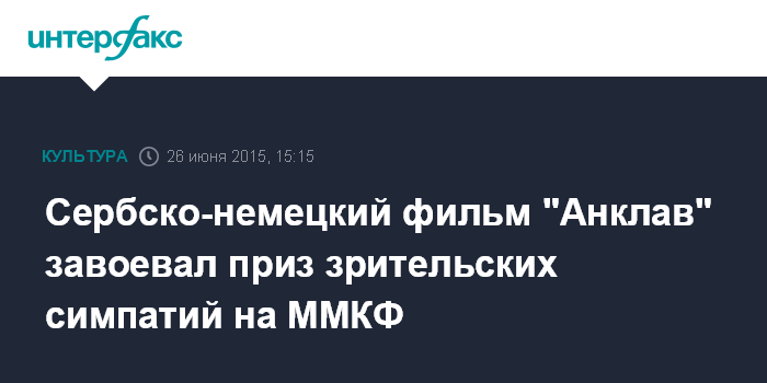 Москва. 26 июня. INTERFAX.RU - Приз зрительских симпатий 37-го Московского международного кинофестиваля (ММКФ) достался сербско-немецкому фильму "Анклав" (режиссер - Горан Радованович), рассказывающему о косовских проблемах, сообщили на пресс-конференции, посвященной присуждению приза зрительских симпатий, а также призов Международной ассоциации кинокритиков (ФИПРЕССИ) и Гильдии киноведов и кинокритиков.