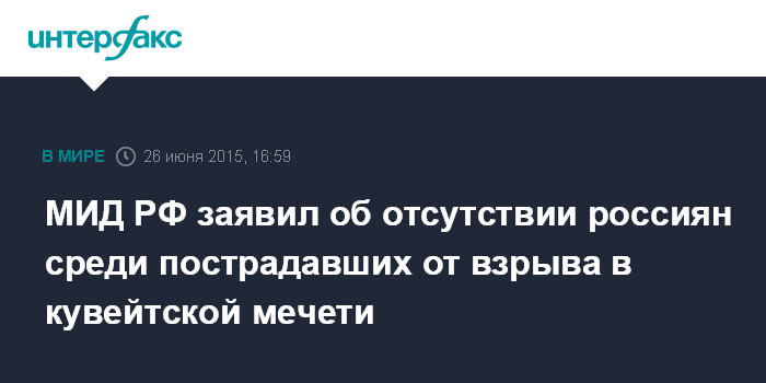 "26 июня в столице Государства Кувейт Эль-Кувейте произошел теракт. По поступающей информации, террорист-смертник подорвал себя, находясь среди собравшихся на пятничную молитву прихожан шиитской мечети в районе Эс-Савабир. Согласно предварительным данным, в результате этой диверсии погибли по меньшей мере 15 человек, десятки получили ранения. Российских граждан среди пострадавших нет", - говорится в сообщении МИД РФ.
