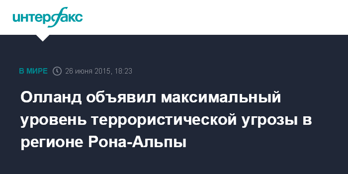 Москва. 26 июня. INTERFAX.RU - Уровень террористической угрозы в регионе Рона-Альпы во Франции будет максимальным в течение ближайших трех дней, заявил в пятницу президент Франции Франсуа Олланд.