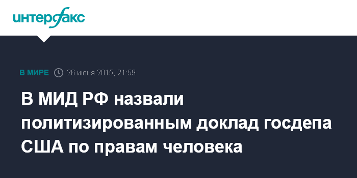 Москва. 26 июня. INTERFAX.RU - В МИД РФ раскритиковали содержание ежегодного доклада Госдепартамента США о ситуации с правами человека в мире, посчитав его идеологизированным и построенном на оторванной от реальности логике.