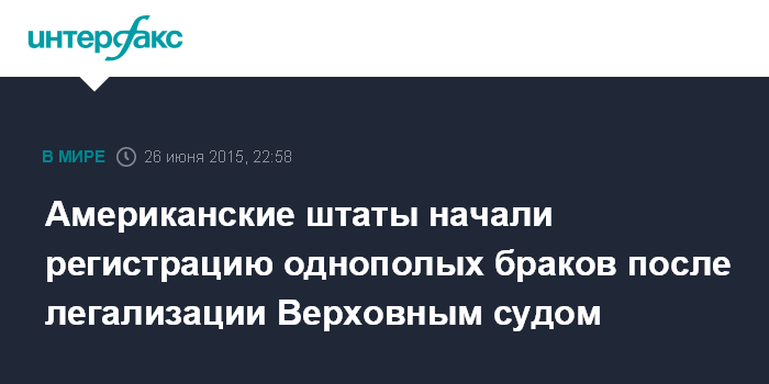 Москва. 26 июня. INTERFAX.RU - Однополым парам в ряде американских штатов начали выдавать свидетельства о браке после того, как Верховный суд США признал правомерной их регистрацию на всей территории страны. Об этом сообщает AP.