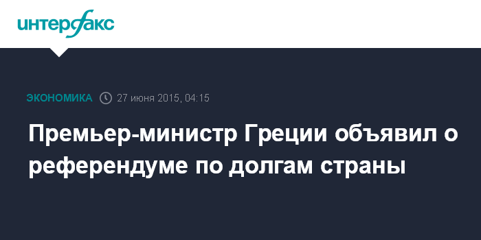 Москва. 27 июня. INTERFAX.RU - Премьер-министр Греции Алексис Ципрас заявил о намерении провести 5 июля референдум по программе финансовой помощи стране со стороны международных кредиторов. Об этом сообщает BBC.