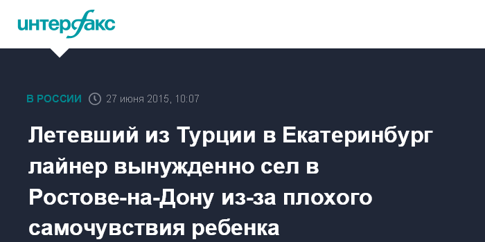 Москва. 27 июня. INTERFAX.RU - Авиалайнер "Боинг-757", летевший из Анталии в Екатеринбург, в субботу был вынужден приземлиться в аэропорту Ростова-на-Дону из-за того, что одному из малолетних пассажиров стало плохо, сообщили "Интерфаксу" в пресс-службе аэропорта.