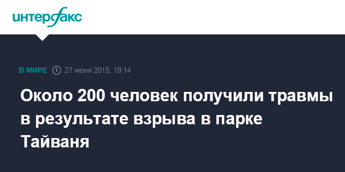 Москва. 27 июня. INTERFAX.RU - Примерно 200 человек пострадали в результате сильного пожара, вспыхнувшего в одном из парков на севере Тайваня, сообщают в субботу тайваньские СМИ.