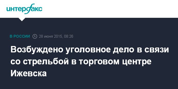 Москва. 28 июня. INTERFAX.RU - Полиция возбудила уголовное дело о хулиганстве в связи со стрельбой в торговом центре Ижевска, сообщает пресс-служба МВД по Удмуртии в воскресенье.