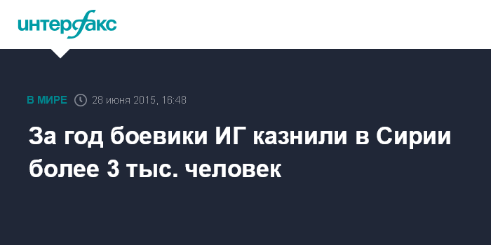 Москва. 28 июня. INTERFAX.RU - Боевики из группировки "Исламское государство" (ИГ) казнили 3 027 человек в Сирии с момента объявления халифата год назад, сообщили в воскресенье в Наблюдательном совете по правам человека в Сирии.