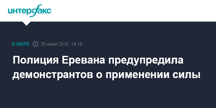 Москва. 28 июня. INTERFAX.RU - Полиция Армении потребовала от демонстрантов на проспекте Баграмяна в центре Еревана незамедлительно освободить территорию и перейти на площадь Свободы, пригрозив применить силу.