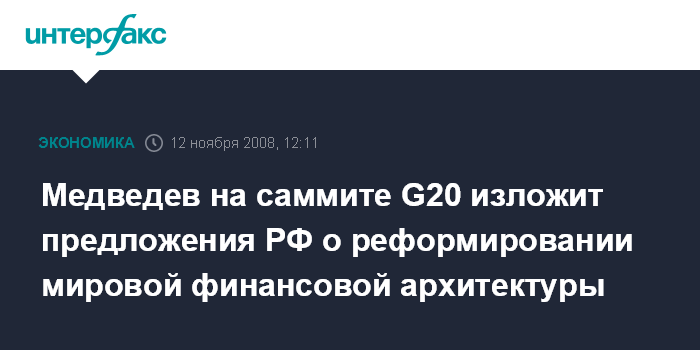 "России принадлежит важная роль в борьбе с глобальным финансовым кризисом и решении задачи реформирования мировой финансовой архитектуры, и Медведев в своем выступлении на саммите изложит конкретные предложения российской стороны на этот счет", - говорится в сообщении пресс-службы.