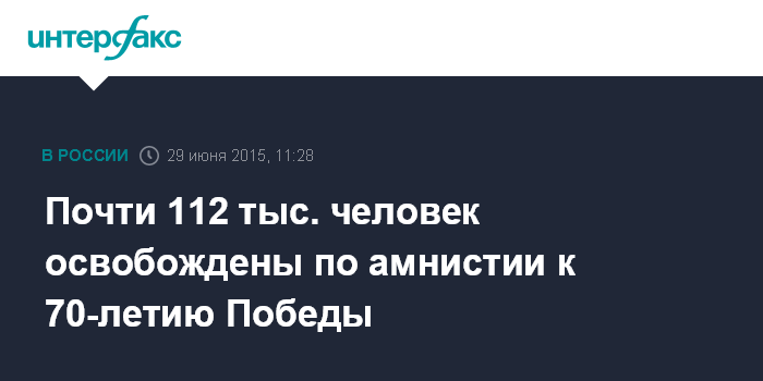 Москва. 29 июня. INTERFAX.RU - Уже свыше 110 тысяч россиян освобождены от уголовной ответственности по амнистии, приуроченной к 70-летию Победы в Великой Отечественной войне, сообщил врио замглавы ФСИН Валерий Максименко.