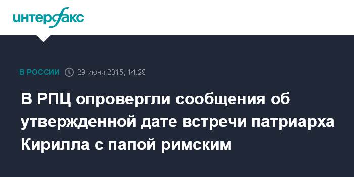 Москва. 29 июня. INTERFAX.RU - В Отделе внешних церковных связей (ОВЦС ) опроверли сообщения СМИ о том, что вопрос конкретного срока и места проведения встречи патриарха Кирилла с папой римским уже решен, сообщил корреспонденту "Интерфакс" секретарь ОВЦС по межхристианским связям иеромонах Стефан (Игумнов).