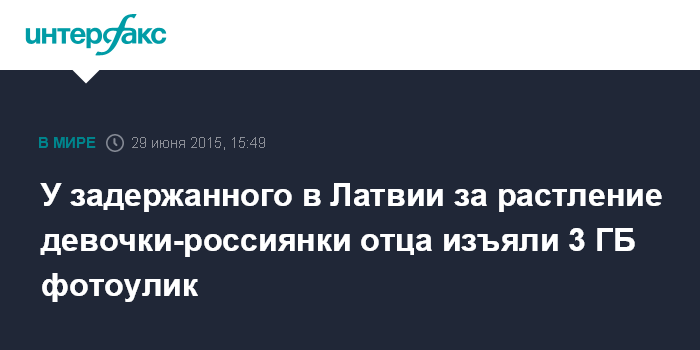 Москва. 29 июня. INTERFAX.RU - Правоохранительные органы Латвии изъяли порядка 3 гигабайтов откровенных фото и видео в рамках расследования дела о растлении малолетней дочери-россиянки ее отцом, заявил помощник уполномоченного при президенте РФ по правам ребенка Ренат Абдеев.