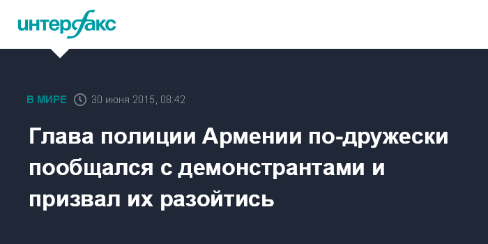 Москва. 30 июня. INTERFAX.RU - Начальник полиции Армении Владимир Гаспарян пообщался с участниками акции протеста против повышения тарифов на электричество на проспекте Баграмяна в центре Еревана, призвав их завершить акцию и уйти домой, передает корреспондент "Интерфакса".
