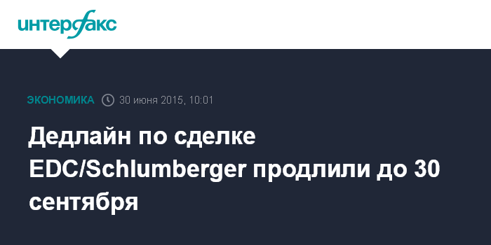 Москва. 30 июня. INTERFAX.RU – Срок сделки между нефтесервисными компаниями Schlumberger и Eurasia Drilling Company (EDC) перенесен на 30 сентября в ожидании одобрения правкомиссии по иностранным инвестициям, сообщила EDC.